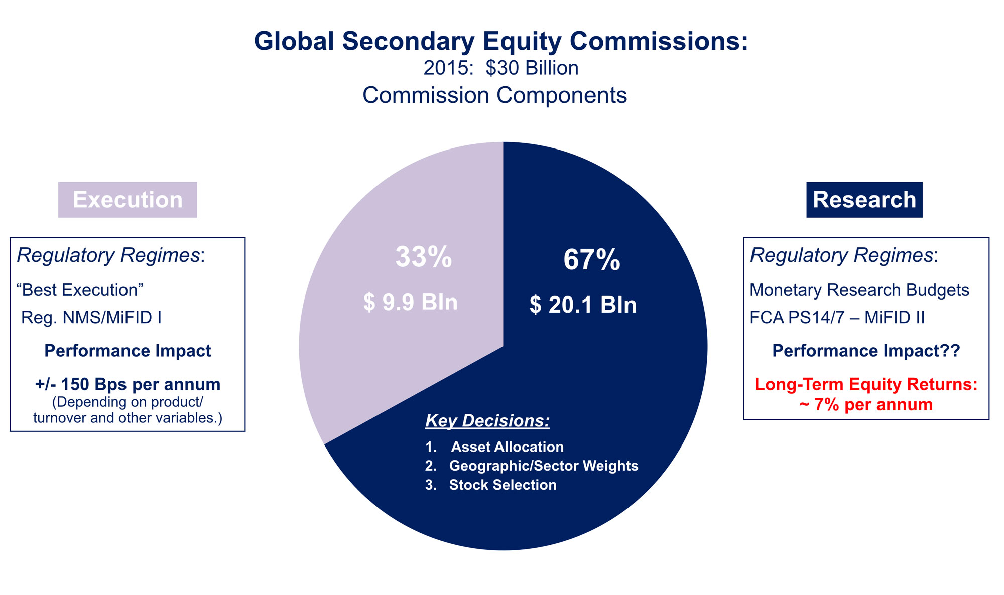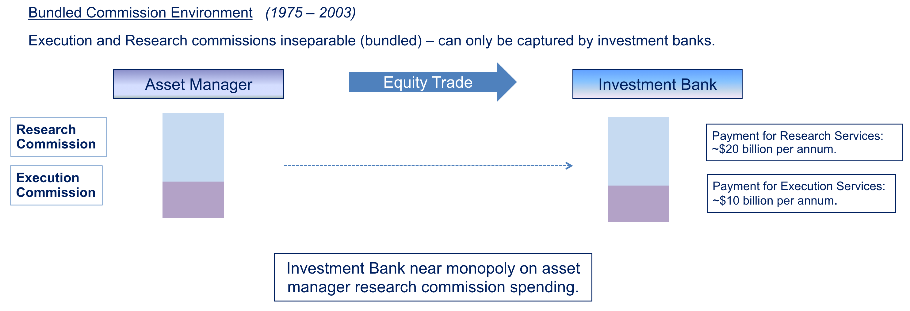 In the “bundled” model, payment for the research required an equity execution relationship with every (brokerage or bank) research producer. “Best Execution” requirements included in Reg. NMS (US) and MiFID I (Europe) challenged this notion. The research and execution capabilities of banks varied - it was unlikely that all research counter-parties could provide “best execution”.