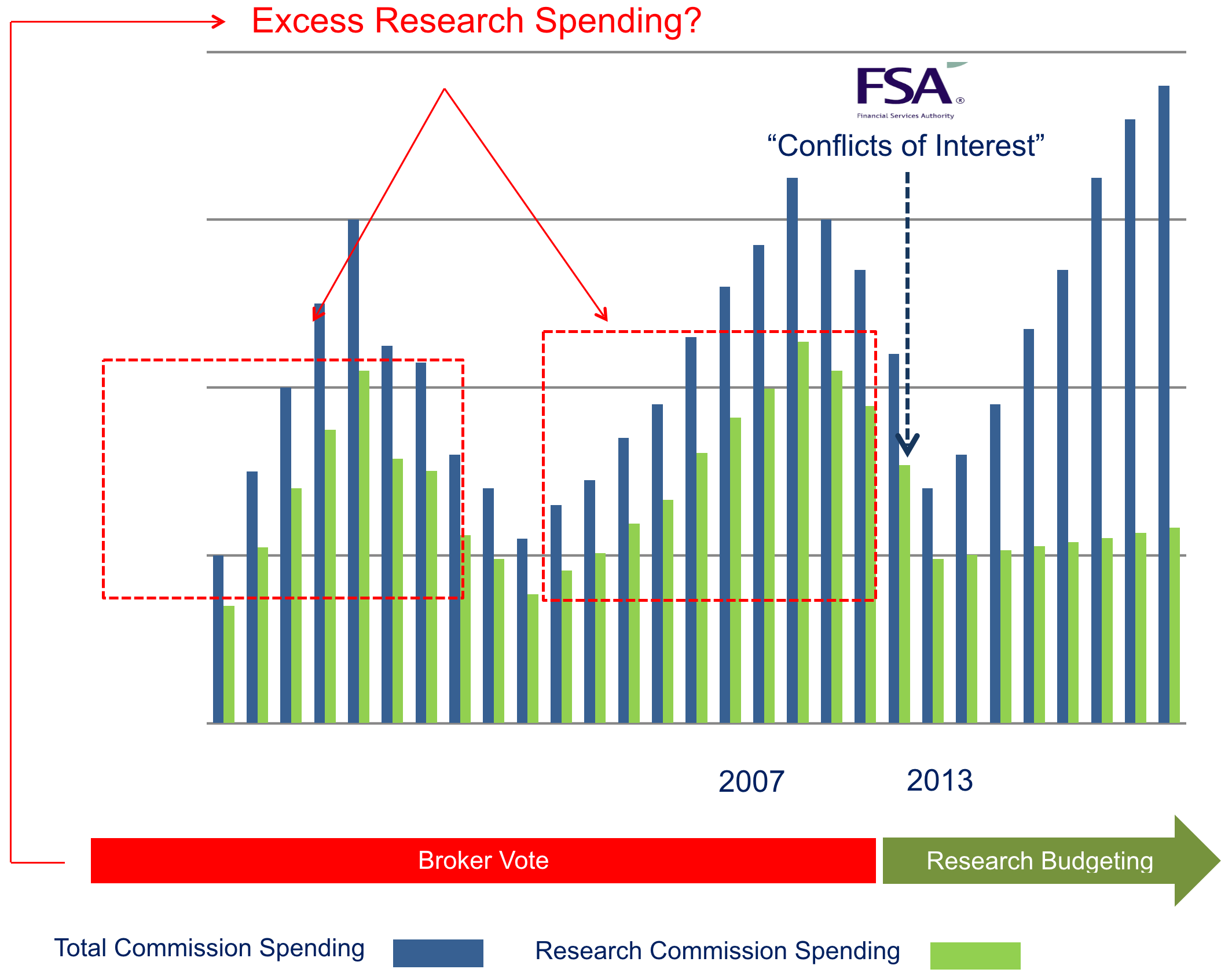 This potentially reduced returns to end investors, who funded the research commission spending. (Commissions are deducted from returns). The UK FSA and EMSA in Europe via MiFID II both require the separation of research and execution payments to control theoretically unlimited research commission spending. Asset managers are required to establish ex-ante monetary research budgets rather than broker vote research commission allocations.